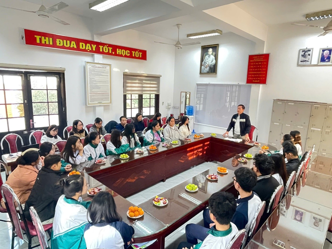 Ảnh thầy giáo Nguyễn Sơn- Hiệu trưởng nhà trường cùng thầy giáo cùng các thầy giáo, cô giáo trong buổi gặp mặt động viên các em học sinh trước kỳ thi HSG cấp Tỉnh năm học 2025-2026